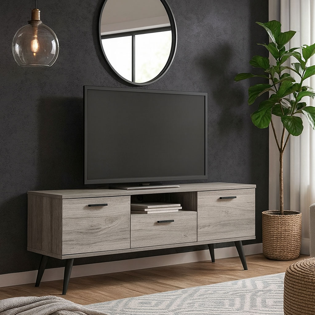 Είναι κατασκευασμένο από μοριοσανίδα (νοβοπάν), ένα παράγωγο ξύλου από μικρά κομμάτια ξύλου και πριονίδι. Εξωτερικά έχει επένδυση μελαμίνης, η οποία προσφέρει ανθεκτικότητα στα γρατζουνίσματα, στην τριβή και στα διαβρωτικά. Διαθέτει τους απαραίτητους χώρους για την οργάνωση και αποθήκευση μικροαντικειμένων. Σύμφωνα με τις διαστάσεις του, είναι κατάλληλο για τοποθέτηση τηλεόρασης μεγέθους έως και 65" καθώς προτείνεται να είναι ελαφρώς πιο πλατύ από την τηλεόραση.