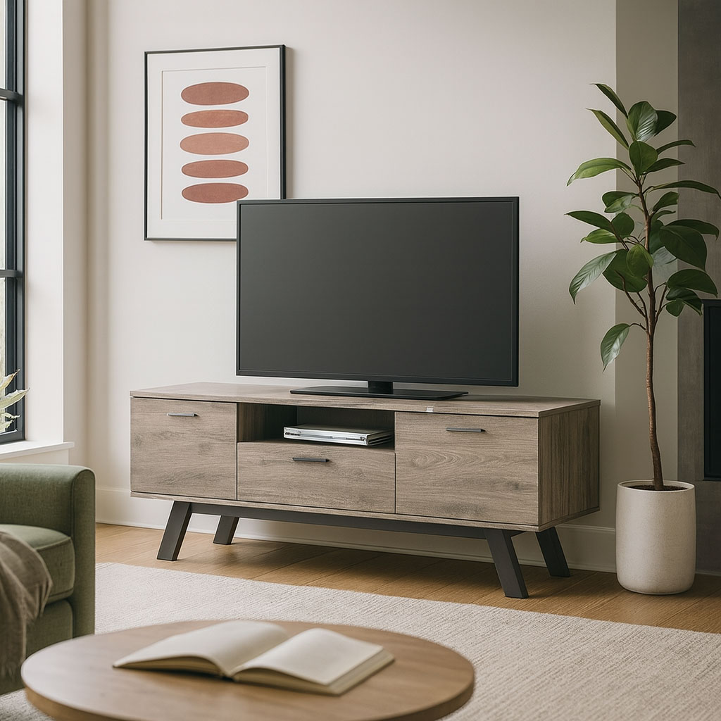 Είναι κατασκευασμένο από μασίφ ξύλο, το οποίο προσφέρει ανθεκτικότητα, σταθερότητα και μεγάλη αντοχή σε βάρος. Διαθέτει τους απαραίτητους χώρους για την οργάνωση και αποθήκευση μικροαντικειμένων. Σύμφωνα με τις διαστάσεις του, είναι κατάλληλο για τοποθέτηση τηλεόρασης μεγέθους έως και 65" καθώς προτείνεται να είναι ελαφρώς πιο πλατύ από την τηλεόραση .