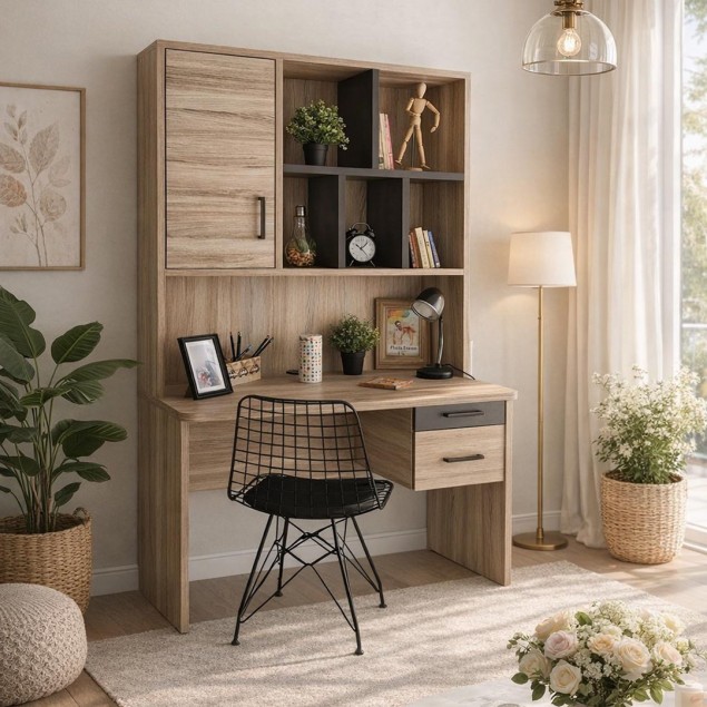 Διαθέτει ευρύχωρη επιφάνεια γραφείου, συρτάρι και ντουλάπι για οργάνωση εγγράφων και αντικειμένων, καθώς και επάνω καπελιέρα με ανοιχτά ράφια και κλειστό χώρο, ιδανική για βιβλία, διακοσμητικά ή είδη γραφείου. Ο σχεδιασμός του το καθιστά κατάλληλο για φοιτητικό δωμάτιο, home office ή επαγγελματικό χώρο, προσφέροντας εργονομία και αισθητική αρμονία.