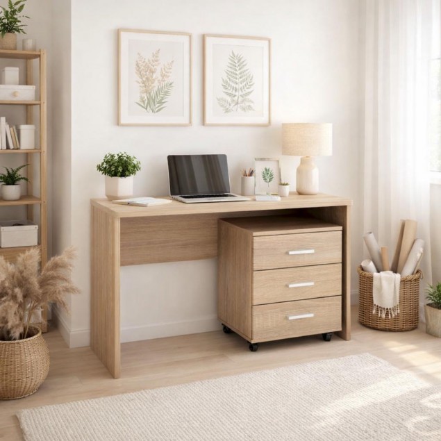 Κομψό και λειτουργικό γραφείο ελληνικής κατασκευής σε φυσική ξύλινη απόχρωση, ιδανικό για οικιακό γραφείο ή χώρο εργασίας. Ο μίνιμαλ σχεδιασμός του προσφέρει άνετη επιφάνεια εργασίας για υπολογιστή και έγγραφα, ενώ η αποσπώμενη συρταριέρα με τρία συρτάρια και ροδάκια παρέχει ευελιξία και άνετη αποθήκευση. Η δυνατότητα μετακίνησης της συρταριέρας επιτρέπει την προσαρμογή του χώρου στις ανάγκες σας, καθιστώντας το γραφείο πρακτικό και εργονομικό. Το φυσικό ξύλο και οι καθαρές γραμμές το καθιστούν ιδανικό για μοντέρνους, σκανδιναβικούς ή minimal χώρους, δημιουργώντας ένα φωτεινό και οργανωμένο περιβάλλον εργασίας.