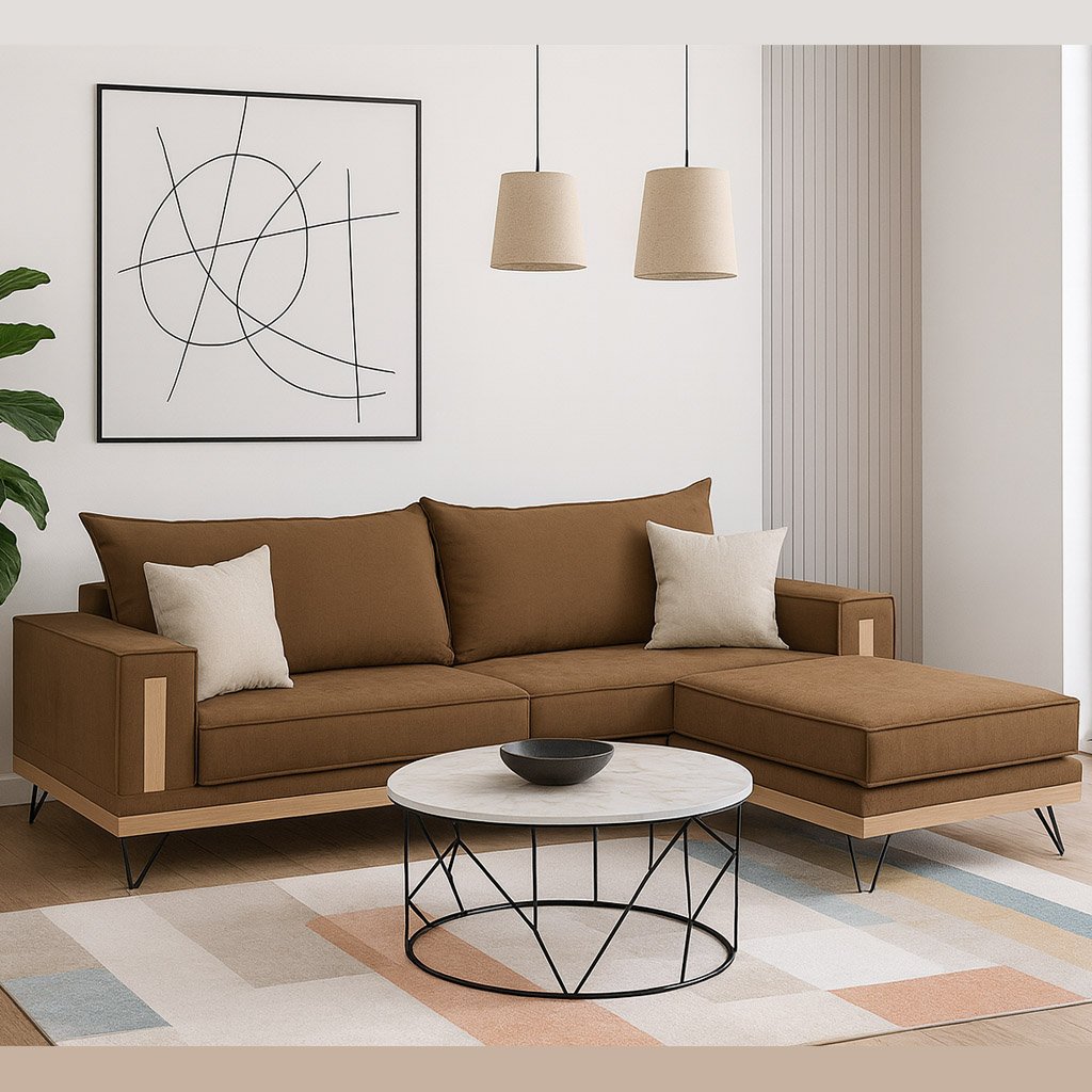 Σύστημα καναπέ αποτελούμενο από ένα καναπέ 3 θέσεων και ένα σκαμπό. Δυνατότητα αντιστοφής της γωνίας από δεξιά στα αριστερά και αντίστροφα, με μια απλή μετακίνηση του σκαμπού.