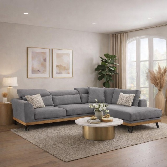 Το ύφασμα σε κομψή γκρι απόχρωση προσδίδει διαχρονικό χαρακτήρα και ταιριάζει εύκολα με κάθε διακοσμητικό στυλ. Η ξύλινη βάση σε φυσικό τόνο και τα μεταλλικά πόδια ενισχύουν τη σταθερότητα, ενώ προσθέτουν μία ζεστή, premium πινελιά.