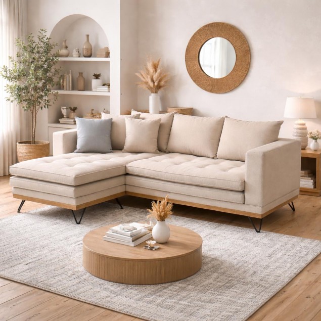 Γωνιακός καναπές με δυνατότητα τοποθέτησης της γωνίας αριστερά ή δεξιά, εύκολα και γρήγορα, με μια απλή μετακίνηση του ταμπουρέ. Διπλά μαξιλάρια καθίσματος σε διαφορετικό χρώμα. Αλλάζοντας τη θέση τους (το κάτω-πάνω και το πάνω-κάτω) αλλάζει η συνολική εικόνα του καναπέ.