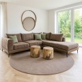 Γωνιακός καναπές με ιδιαίτερο σχέδιο στο μπράτσο και την πλάτη. Τα μαξιλάρια καθίσματος και τα μαξιλάρια πλάτης έχουν διακοσμητικές λεπτομέρειες. Η βάση αποτελείται από ύφασμα και ξύλο με διακοσμητικά στοιχεία ενδιάμεσα.