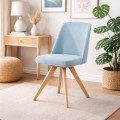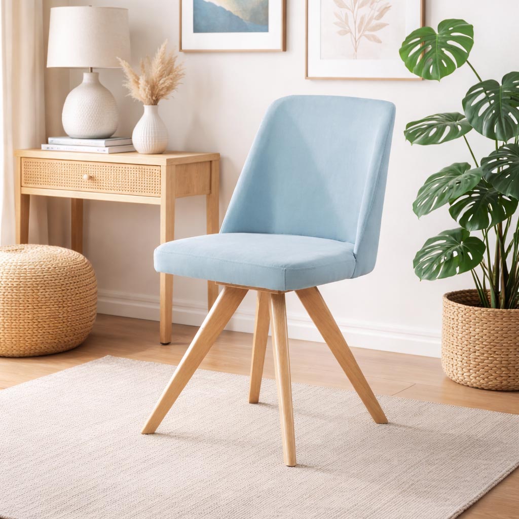 Κομψή και άνετη καρέκλα με μοντέρνο σχεδιασμό που συνδυάζει απαλό ύφασμα σε γαλάζια απόχρωση και φυσικά ξύλινα πόδια. Η αναπαυτική πλάτη και το μαλακό κάθισμα προσφέρουν άνεση τόσο για καθημερινή χρήση όσο και για επίσημους χώρους. Ιδανική επιλογή για τραπεζαρία, καθιστικό, υπνοδωμάτιο ή επαγγελματικούς χώρους, προσθέτει φωτεινότητα και στυλ σε κάθε διακόσμηση.