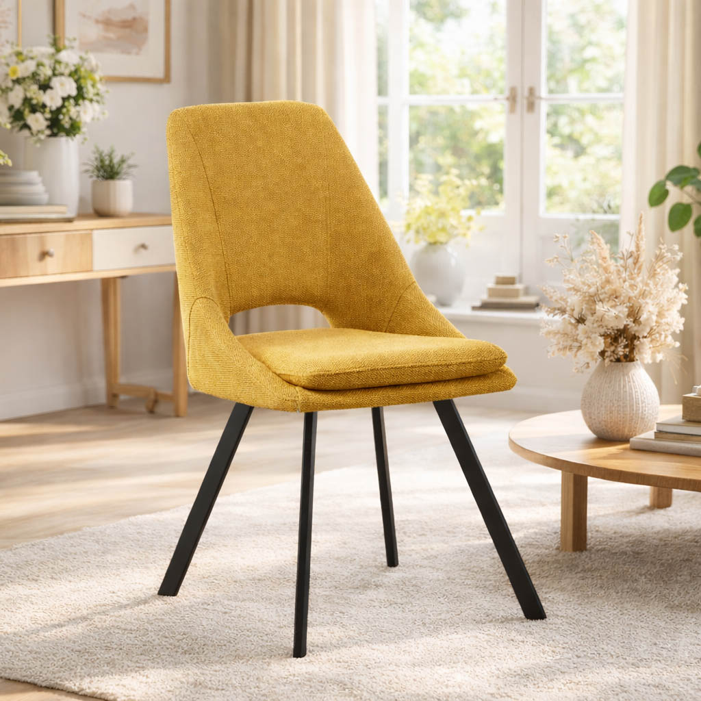 Η καρέκλα διαθέτει σύγχρονο και κομψό σχεδιασμό που συνδυάζει άνεση και αισθητική. Είναι επενδυμένη με υψηλής ποιότητας υφασμάτινη ταπετσαρία σε μοντέρνο κίτρινο χρώμα, προσφέροντας ζεστασιά και φωτεινότητα στον χώρο. Η ανατομική πλάτη και το άνετο κάθισμα εξασφαλίζουν ξεκούραστη χρήση, ενώ τα μαύρα μεταλλικά πόδια προσδίδουν σταθερότητα και μοντέρνο χαρακτήρα. Ιδανική επιλογή για τραπεζαρία, κουζίνα ή επαγγελματικό χώρο με σύγχρονο στυλ.