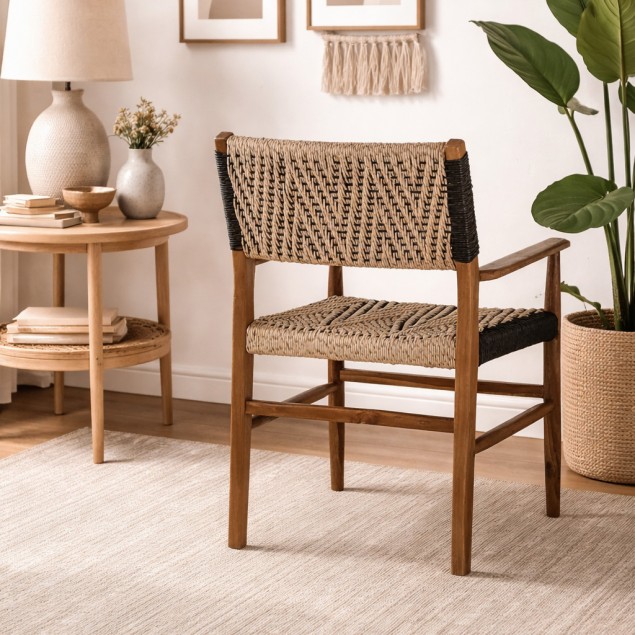 Ο εργονομικός σχεδιασμός με μπράτσα εξασφαλίζει ξεκούραστη χρήση, ενώ η φυσική υφή των υλικών προσδίδει ζεστασιά και αυθεντικότητα στον χώρο. Ιδανική επιλογή για τραπεζαρία, καθιστικό ή επαγγελματικούς χώρους φιλοξενίας, ταιριάζει άψογα σε boho, ethnic, coastal αλλά και μοντέρνα φυσικά στυλ διακόσμησης.