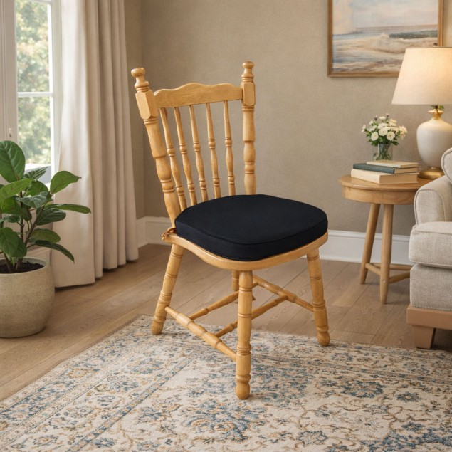Το κάθισμα συνοδεύεται από αναπαυτικό μαξιλάρι σε μαύρη απόχρωση, το οποίο προσθέτει κομψή αντίθεση και εξασφαλίζει άνεση κατά το κάθισμα. Οι καμπύλες γραμμές και τα γυριστά πόδια χαρίζουν διαχρονικό χαρακτήρα, επιτρέποντας στην καρέκλα να ταιριάζει αρμονικά τόσο σε παραδοσιακούς όσο και σε μοντέρνους χώρους.