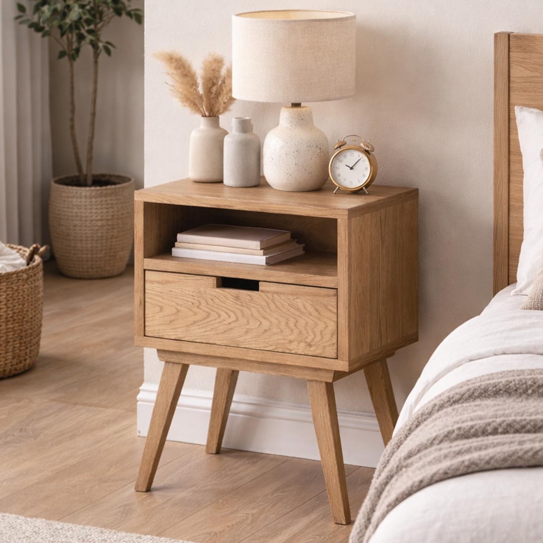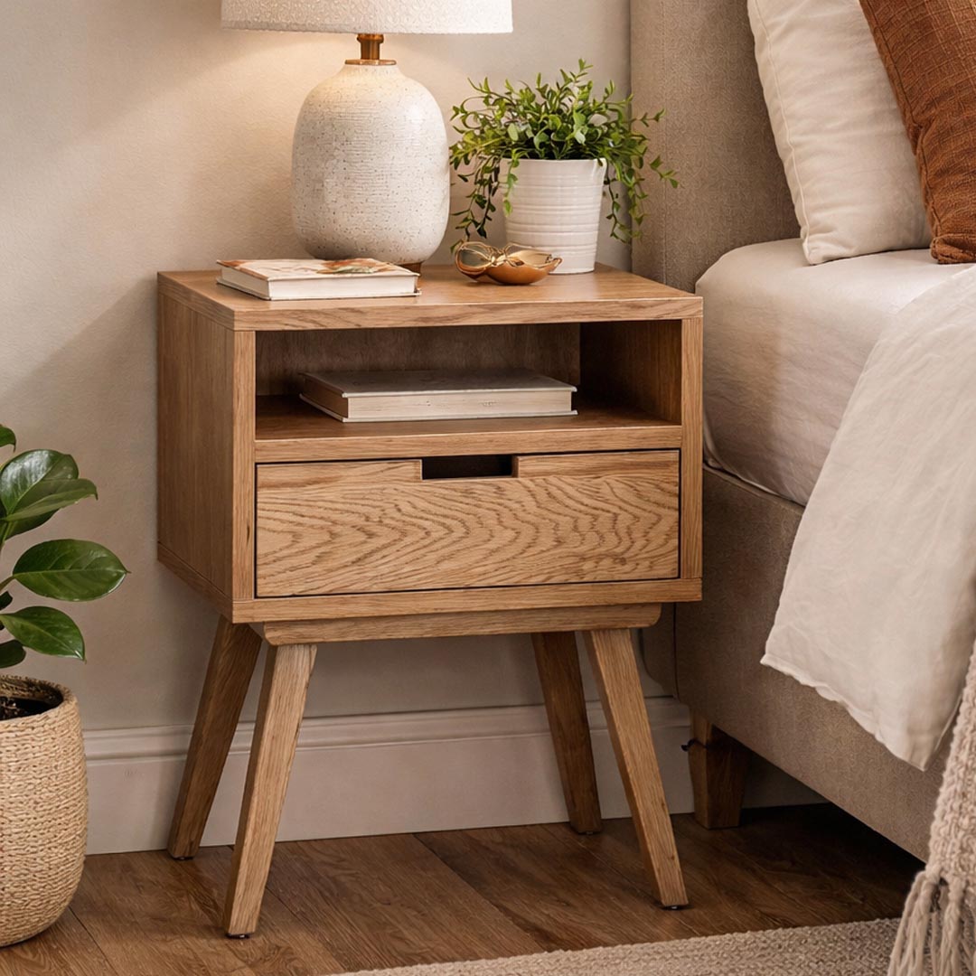 Κομοδίνο μοντέρνου σχεδιασμού κατασκευασμένο από υψηλής ποιότητας MDF με επένδυση δρυός και μασίφ ξύλινα πόδια. Ο συνδυασμός φυσικής υφής ξύλου και minimal γραμμών δημιουργεί ένα κομψό και διαχρονικό έπιπλο που ταιριάζει ιδανικά σε σύγχρονους αλλά και κλασικούς χώρους υπνοδωματίου.