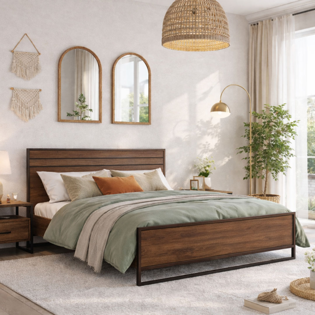 Το κρεβάτι είναι κατασκευασμένο από ανθεκτική μελαμίνη υψηλής ποιότητας, σε ζεστή απόχρωση καρυδιού που αναδεικνύει τη φυσική αίσθηση του ξύλου. Ο σχεδιασμός του συνδυάζει αρμονικά τη μοντέρνα αισθητική με διαχρονικά στοιχεία, χάρη στις κομψές σιδερένιες λεπτομέρειες σε μαύρο ματ φινίρισμα.