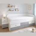 Το παιδικό ξύλινο κρεβάτι αυτό συνδυάζει σύγχρονο σχεδιασμό, λειτουργικότητα και ασφάλεια, αποτελώντας ιδανική επιλογή για παιδικό ή νεανικό δωμάτιο. Ο σκελετός σε λευκή απόχρωση χαρίζει φωτεινότητα και καθαρότητα στον χώρο, ενώ οι γκρι λεπτομέρειες στα συρτάρια προσθέτουν μια μοντέρνα και διακριτική αντίθεση.