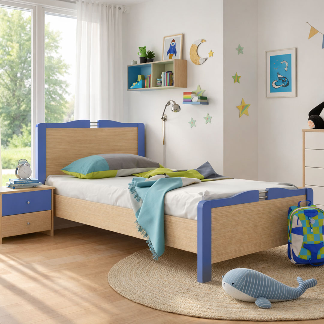 Το παιδικό κρεβάτι αυτό συνδυάζει λειτουργικότητα, αντοχή και χαρούμενο σχεδιασμό, αποτελώντας ιδανική επιλογή για παιδικό ή εφηβικό δωμάτιο. Διαθέτει στιβαρό ξύλινο σκελετό σε φυσική απόχρωση, που προσφέρει σταθερότητα και μεγάλη διάρκεια ζωής, ενώ οι μπλε λεπτομέρειες στο κεφαλάρι και στο ποδαρικό προσθέτουν μια παιχνιδιάρικη και μοντέρνα πινελιά.