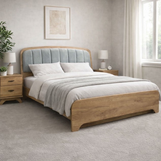 Μοντέρνο ξύλινο κρεβάτι με επενδυμένο κεφαλάρι, σχεδιασμένο για άνεση και κομψότητα. Ο σκελετός από φυσικό ξύλο προσφέρει αντοχή και σταθερότητα, ενώ το υφασμάτινο κεφαλάρι σε απαλό γαλάζιο-πράσινο τόνο προσθέτει αίσθηση ζεστασιάς και σύγχρονου design στο υπνοδωμάτιο.
