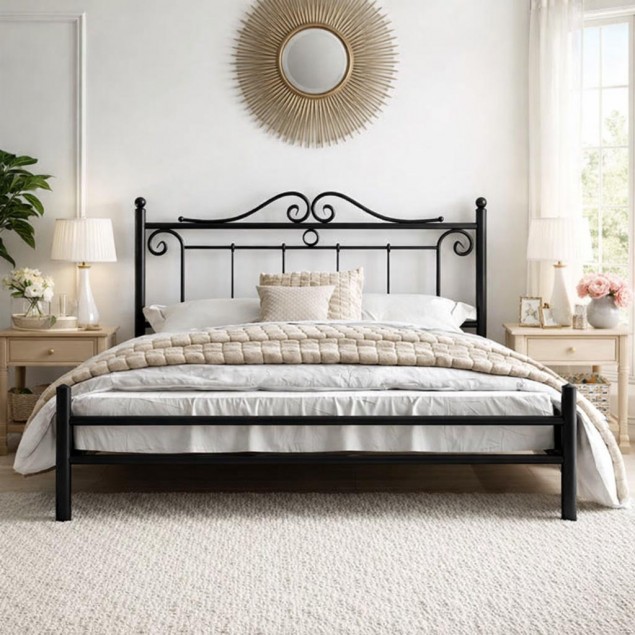Κομψό μεταλλικό κρεβάτι σε μαύρη ματ απόχρωση, με διαχρονικό σχεδιασμό και καλαίσθητες καμπύλες στο κεφαλάρι και το ποδαρικό. Η στιβαρή κατασκευή του εξασφαλίζει ανθεκτικότητα και σταθερότητα, ενώ ο elegant χαρακτήρας του ταιριάζει ιδανικά τόσο σε κλασικά όσο και σε μοντέρνα υπνοδωμάτια. Η ανοιχτή του γραμμή προσδίδει αίσθηση ελαφρότητας και φωτεινότητας στον χώρο, δημιουργώντας ένα ζεστό και φιλόξενο περιβάλλον για ξεκούραση και χαλάρωση.