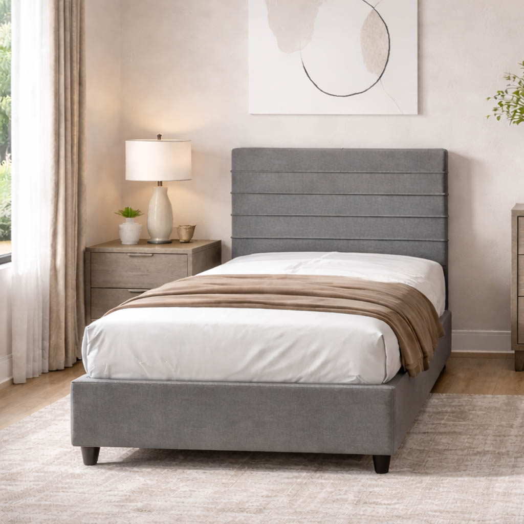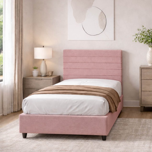 Ένα μοντέρνο και κομψό μονό κρεβάτι διαστάσεων 90x200, σχεδιασμένο για να προσφέρει άνεση και αισθητική αρμονία στον χώρο. Διαθέτει επενδυμένο σκελετό και κεφαλάρι με οριζόντια ραφή, ντυμένα με απαλό ύφασμα σε ροζ παστέλ απόχρωση, που προσδίδει ζεστασιά και διακριτική κομψότητα στο υπνοδωμάτιο.