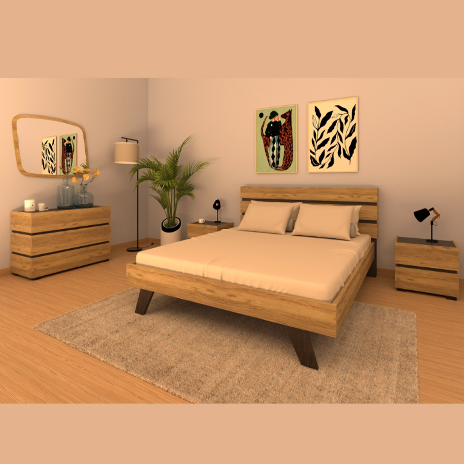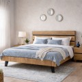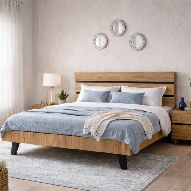 Διαθέτει σκούρες γκρι λεπτομέρειες που τονίζουν και φέρνουν σε πρώτο πλάνο τις ξύλινες επιφάνειες του κρεβατιού.