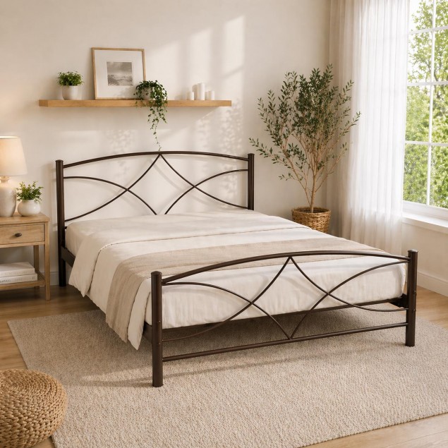 Ένα κομψό και διαχρονικό μεταλλικό κρεβάτι που συνδυάζει μίνιμαλ αισθητική με ζεστή, φυσική ατμόσφαιρα. Ο σκελετός του διαθέτει καμπύλες γραμμές και διακριτικό σχέδιο που προσθέτει χαρακτήρα χωρίς να βαραίνει τον χώρο. Το σκούρο μεταλλικό φινίρισμα δημιουργεί όμορφη αντίθεση με ουδέτερους τόνους και ξύλινα στοιχεία, καθιστώντας το ιδανικό για σύγχρονα, σκανδιναβικά ή rustic υπνοδωμάτια.