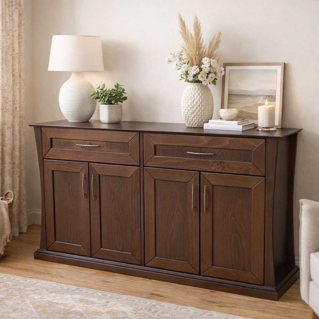 Κομψός μπουφές σε σκούρα καφέ απόχρωση, κατασκευασμένος από ανθεκτικό ξύλο υψηλής ποιότητας. Διαθέτει δύο ευρύχωρα συρτάρια και τέσσερα ντουλάπια με εσωτερικά ράφια, προσφέροντας άφθονο αποθηκευτικό χώρο για σερβίτσια, λευκά είδη ή καθημερινά αντικείμενα. Ο διαχρονικός σχεδιασμός με γεωμετρικές λεπτομέρειες στα πορτάκια και μεταλλικά χερούλια προσθέτει ζεστασιά και φινέτσα σε κάθε χώρο, από το σαλόνι μέχρι την τραπεζαρία ή το γραφείο.
