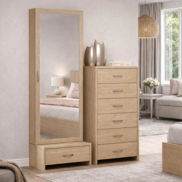 Ένα κομψό και λειτουργικό σετ επίπλων ιδανικό για σύγχρονα και φωτεινά υπνοδωμάτια. Η φυσική όψη ξύλου προσδίδει ζεστασιά και διαχρονικό στυλ, ενώ ο λιτός σχεδιασμός επιτρέπει εύκολη προσαρμογή σε κάθε διακόσμηση.