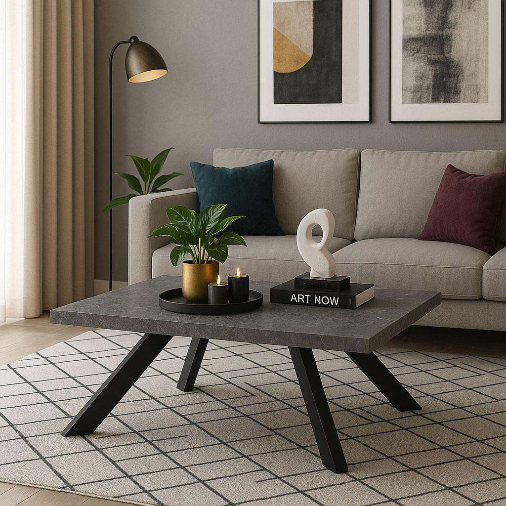 Τραπεζάκι σαλονιού είναι χαμηλό και κατάλληλο για τοποθέτηση μπροστά από καναπέ. Είναι ορθογώνιο και αποτελείται από μέταλλο και Μελαμίνη
