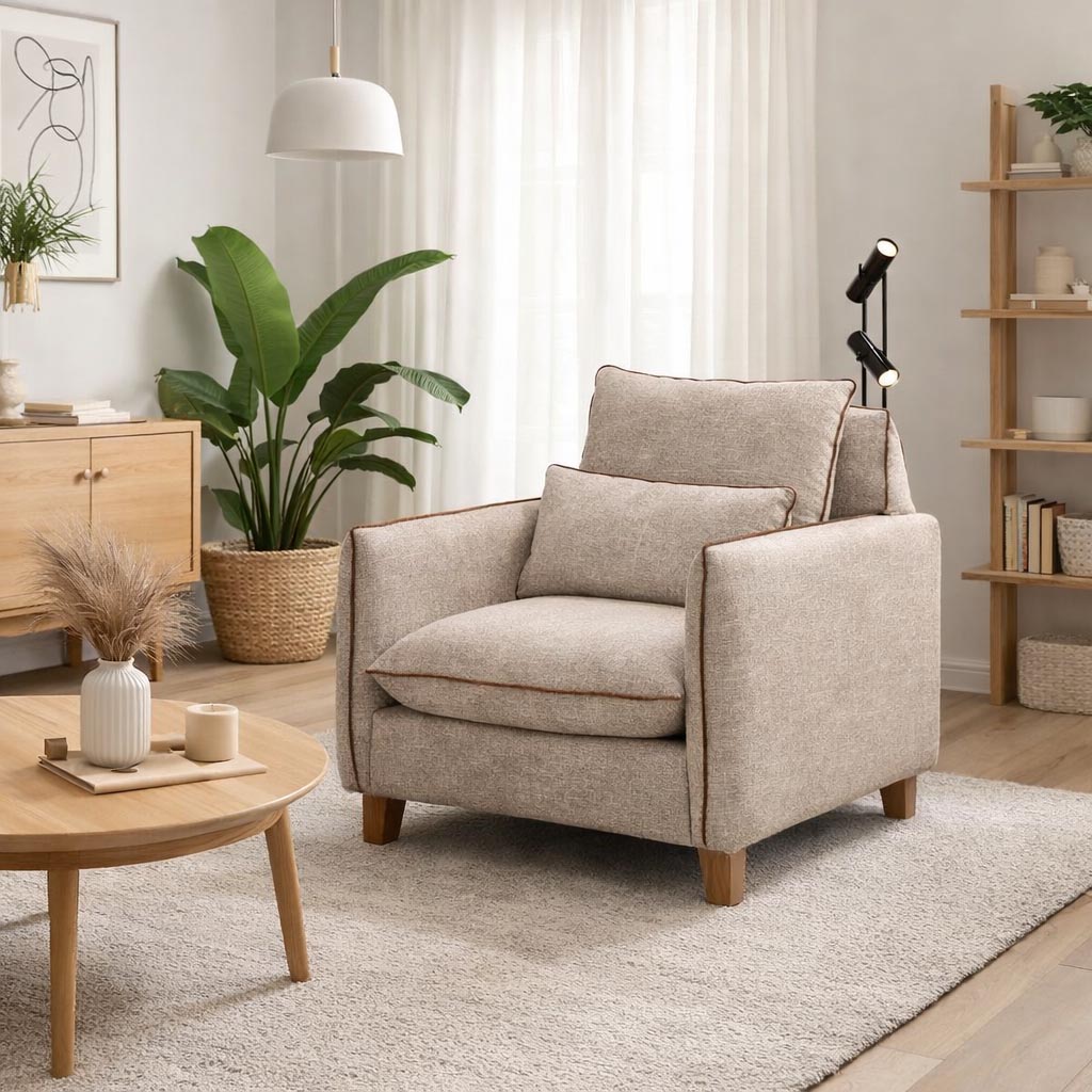 Η πολυθρόνα διαθέτει ανθεκτικό σκελετό από μασίφ οξιά, προσφέροντας σταθερότητα και μεγάλη διάρκεια ζωής. Το ύφασμα είναι αδιάβροχο και easy clean, καθιστώντας την ιδανική για καθημερινή χρήση χωρίς άγχος για λεκέδες.