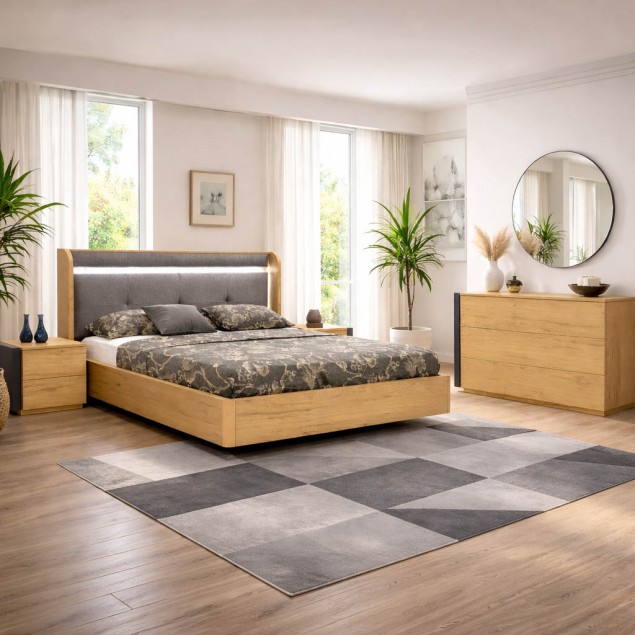 Το σετ περιλαμβάνει διπλό κρεβάτι για στρώμα 160 Χ 200, δύο κομοδίνα, μία συρταριέρα και έναν καθρέφτη.