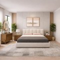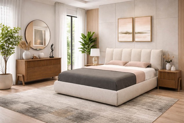 Το σετ κρεβατοκάμαρας αποπνέει διακριτική πολυτέλεια και σύγχρονη αισθητική, συνδυάζοντας φυσικούς τόνους και καθαρές γραμμές. Το κρεβάτι με επενδυμένο κεφαλάρι σε απαλό μπεζ ύφασμα προσφέρει αίσθηση άνεσης και ζεστασιάς, ενώ η λιτή του σχεδίαση το καθιστά ιδανικό για μοντέρνους αλλά και minimal χώρους.