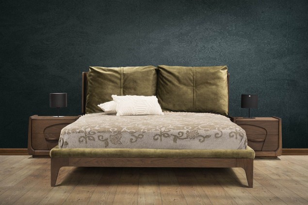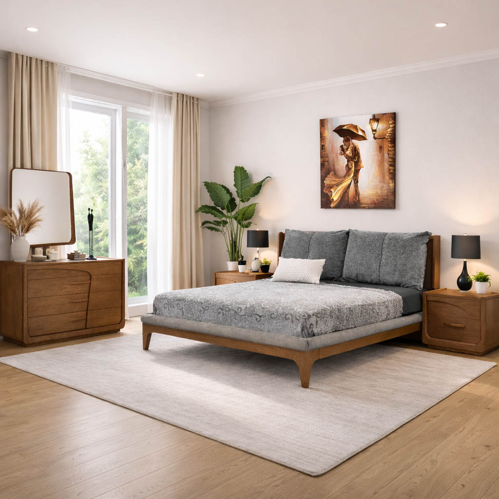 Το κρεβάτι διαθέτει σταθερό ξύλινο σκελετό και επενδυμένο κεφαλάρι σε γκρι ύφασμα υψηλής ποιότητας, προσφέροντας άνεση και στυλ. Τα κομοδίνα και η συρταριέρα ολοκληρώνουν το σετ με εργονομικό σχεδιασμό και απαλές καμπύλες, παρέχοντας πρακτικούς αποθηκευτικούς χώρους.