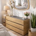 Κομψή και λειτουργική συρταριέρα κρεβατοκάμαρας, σχεδιασμένη για να προσφέρει πρακτικούς αποθηκευτικούς χώρους και υψηλή αισθητική. Η φυσική απόχρωση ξύλου αναδεικνύει τα νερά του και δημιουργεί ζεστή, φιλόξενη ατμόσφαιρα, ενώ οι καθαρές γραμμές της την καθιστούν ιδανική για μοντέρνους αλλά και διαχρονικούς χώρους.