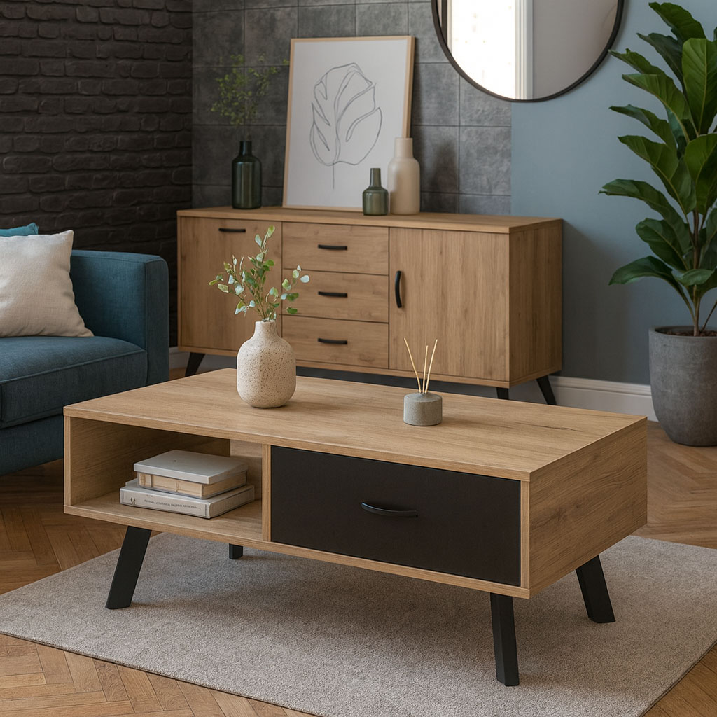 Τραπεζάκι σαλονιού κατάλληλο για τοποθέτηση μπροστά από καναπέ. Είναι ορθογώνιο και αποτελείται από μελαμίνη και μεταλλικά πόδια. Ανθεκτικό στα γρατζουνίσματα, στην τριβή και στα διαβρωτικά. Διαθέτει συρτάρια για έξτρα αποθηκευτικούς χώρους