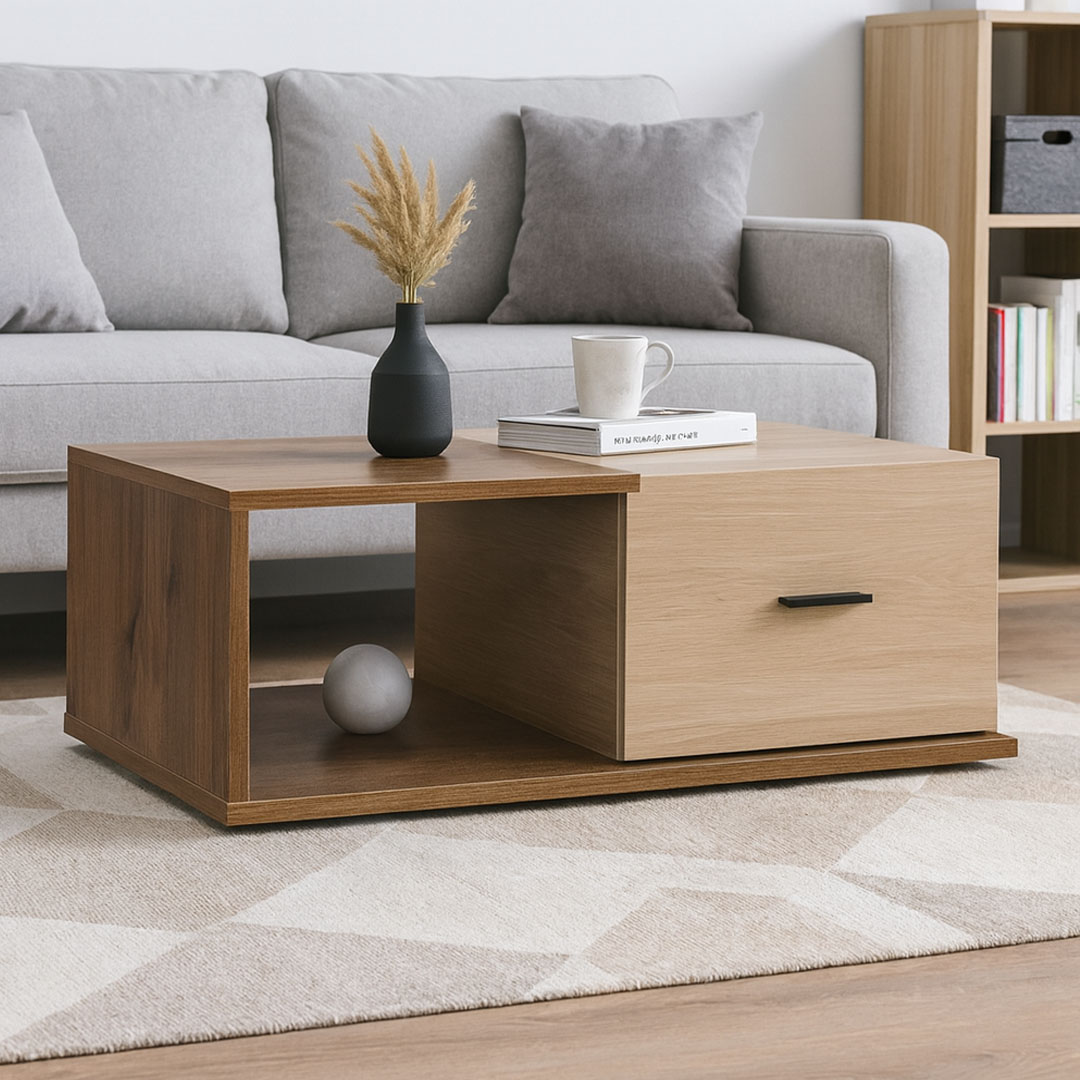 Διαθέτει ένα μεγάλο συρτάρι στη μία πλευρά και ανοιχτούς χώρους αποθήκευσης.