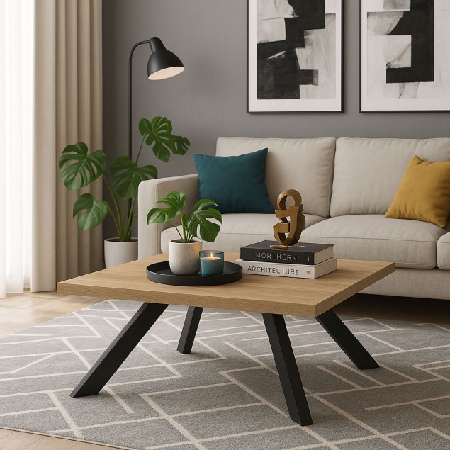 Τραπεζάκι σαλονιού είναι χαμηλό και κατάλληλο για τοποθέτηση μπροστά από καναπέ. Είναι τετράγωνο και αποτελείται από μέταλλο και μελαμίνη. .