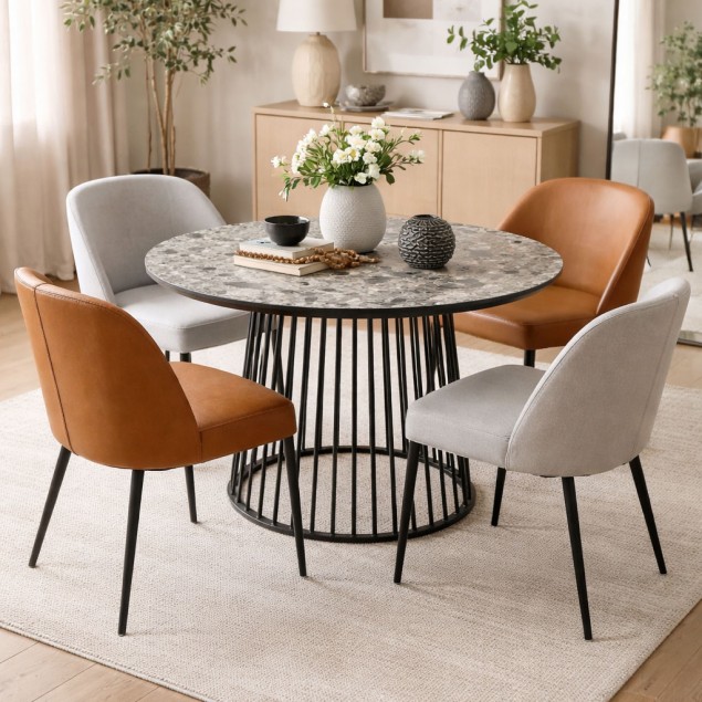 Στρογγυλό τραπέζι που συνδυάζει την μωσαϊκή επιφάνεια με το μέταλλο.