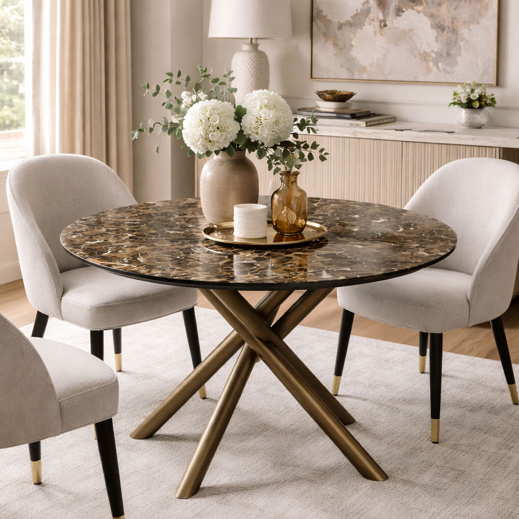 Στρογγυλό τραπέζι που συνδυάζει την κεραμική επιφάνεια με το μέταλλο.
