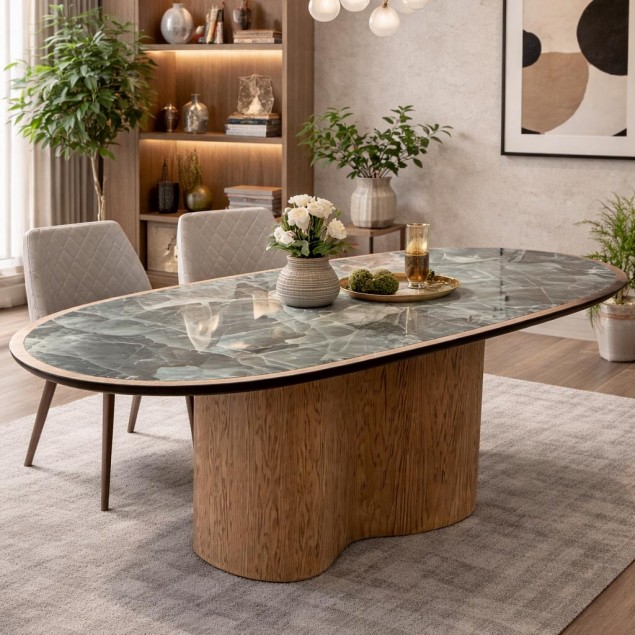 Η δρυινή βάση, με καμπύλες και στιβαρή κατασκευή, προσφέρει σταθερότητα και διαχρονική ζεστασιά, ενώ η κεραμική επιφάνεια εντυπωσιάζει με την πολυτελή όψη της και την υψηλή αντοχή σε γρατζουνιές, θερμότητα και λεκέδες.