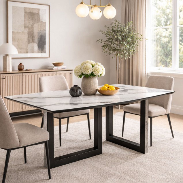 Το τραπέζι τραπεζαρίας ξεχωρίζει για τον σύγχρονο και minimal σχεδιασμό του, συνδυάζοντας αρμονικά την κομψότητα του μαρμάρου με τη δυναμική παρουσία του μετάλλου. Η επιφάνεια από κεραμικό με όψη μαρμάρου προσφέρει πολυτελή αισθητική, υψηλή αντοχή και ευκολία στη συντήρηση, καθιστώντας το ιδανικό για καθημερινή χρήση.